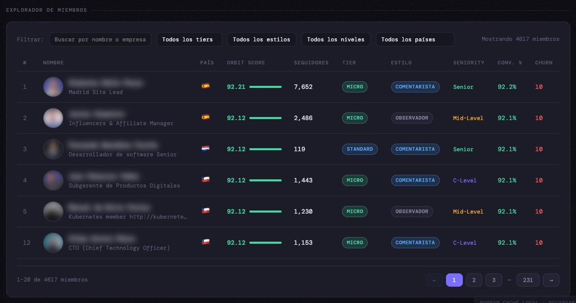 Classify members into orbit levels and track movement over time to spot churn and momentum.